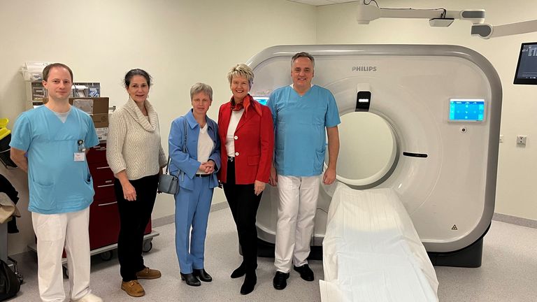 Eingeladen hatte die Stiftung Zukunft Amalie, um einige der medizintechnischen Geräte zu präsentieren, deren Anschaffung beide Stiftungen mit gefördert hatten. Den Anfang machte Prof. Weber, Chefarzt des Immanuel Albertinen Zentrums für Radiologie, mit der Präsentation des neues CT-Systems, das weltweit zu den modernsten seiner Art gehört. Dank Künstlicher Intelligenz (KI) profitieren die Patientinnen und Patienten seit März 2025 von einer deutlich reduzierten Strahlenbelastung sowie einer nochmals verbesserten Bildgebung, die eine äußerst präzise Diagnosestellung sicherstellt. Noch präzisere Diagnostik bei höherem Komfort bietet auch das neue MRT-System, das Mitte Oktober eingeführt wurde.